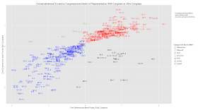 Finally, here's another perspective: The one-dimensional conservativeness scores (ideal points) for the 83rd House and the 84th House, plotted against each other. Note the dramatic changes in all of the seats that changed parties.