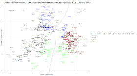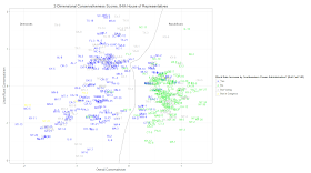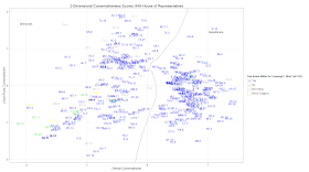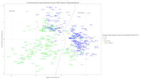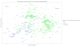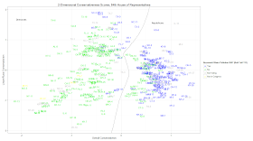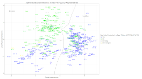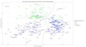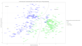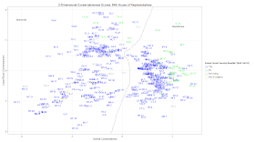 This time around, I called the vertical axis "urban/rural conservativism", although the overall picture is very similar to my look at the 83rd House. You can see the "chunk" of (mostly) Southern Democrats seemingly drifting away from the rest of the Democratic party. But perhaps that's just a modern interpretation.