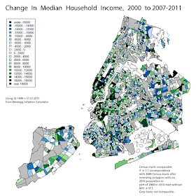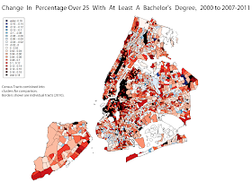 Harlem, Astoria, Prospect Heights, Gowanus, Red Hook, Williamsburg, East Shore Staten Island, and Riverdale all show marked increases in the percentage of residents over 25 with at least a bachelor's degree. But again, step back a bit from the map, and Williamsburg/Prospect Heights, Astoria, and Harlem stand out the most, at least to me. A lot of people claim the South Bronx is gentrifying, or is about to gentrify, and I suppose there are a few tracts that might support that, but I don't think the South Bronx would stand out to me if I wasn't looking for it.
