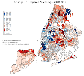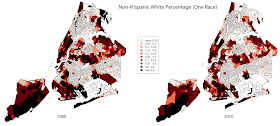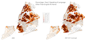 Let's begin with race and ethnicity. Unfortunately, New York City is quite segregated, and with de facto racial/ethnic borders that are very close to what they were 10 years ago. For example, the boundary of Chinatown, in lower Manhattan, is almost precisely the same in 2000 and in 2010.