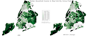 Finally, let's look at median household income. The map of New York City's money stayed pretty stable, with Williamsburg perhaps the clearest visual exception: